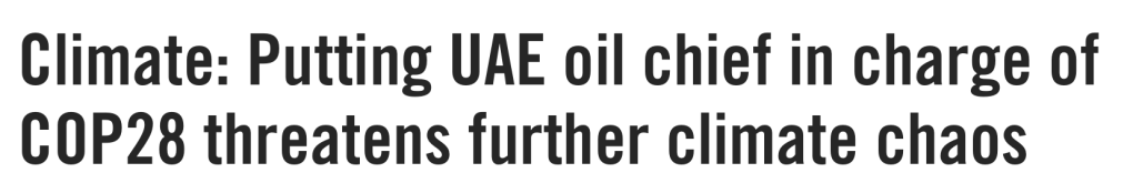 The special envoy for climate change from the United Arab Emirates, host country, Sultan Ahmed Al Jaber is also the CEO of the Abu Dhabi National Oil Company (ADNOC) and head of Masdar, a government renewable energy company. He has made clear statements favouring oil products’ place in our future societies. His appointment has been challenged in by the US and France’s political members as well as NGOs as being a greenwashing spree and he has also collected allegations of misinformation spread by employees and AI online.